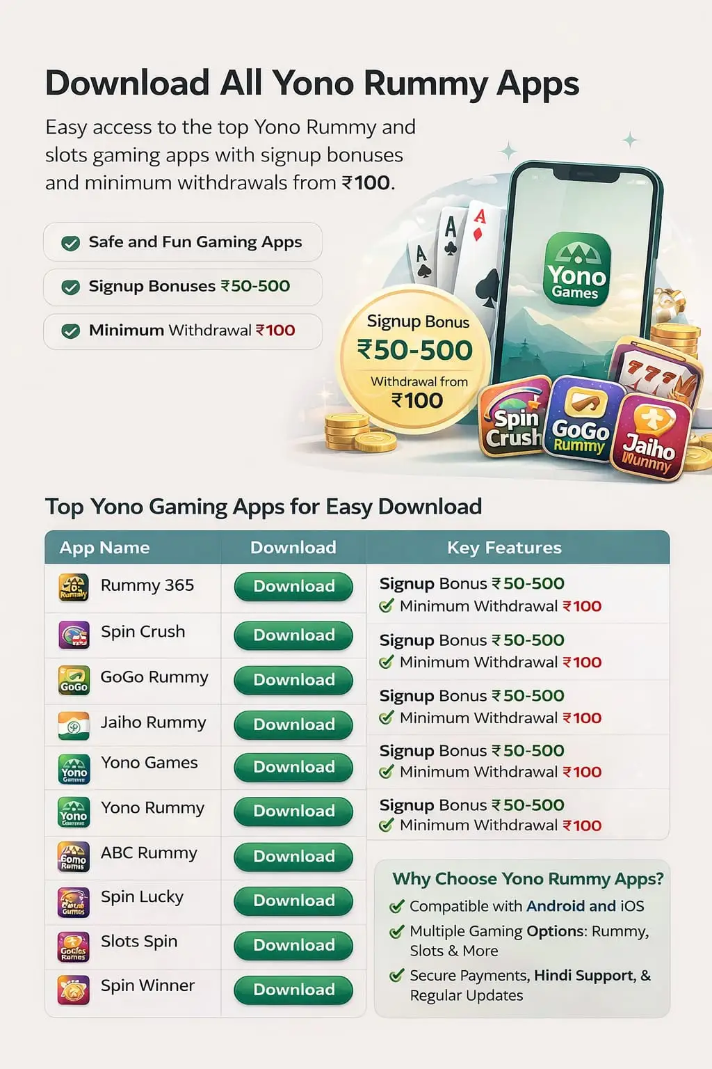 Download all Yono Rummy apps in one place. Check signup bonuses, minimum withdrawal ₹100, and key features before installing.